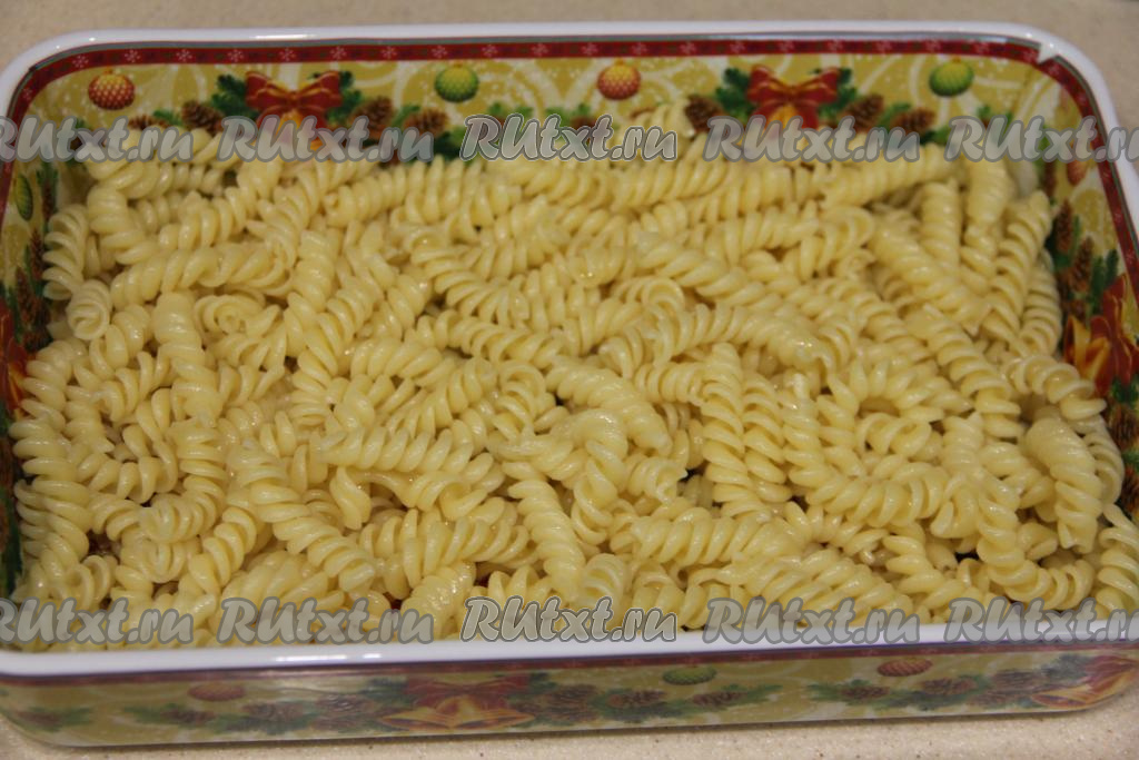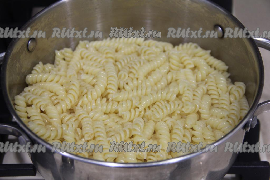 В кастрюле вскипятить воду, подсолить её и выложить макароны (можно взять макаронные изделия любой формы), перемешать и варить с момента закипания на небольшом огне практически до готовности (в течение 7 минут). Затем переложить макароны в дуршлаг, слить воду, промыть их холодной водой, оставить на несколько минут, чтобы стекла лишняя жидкость.