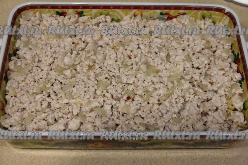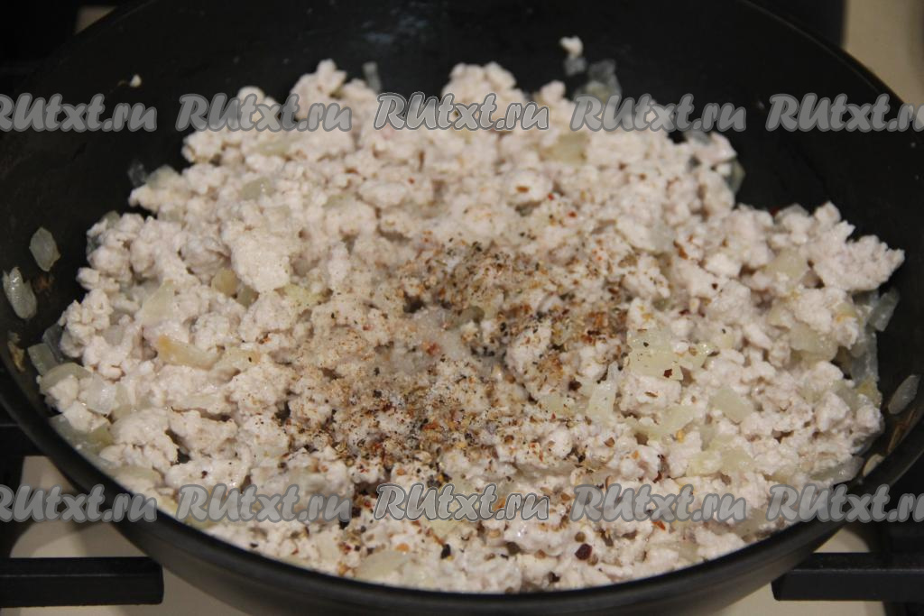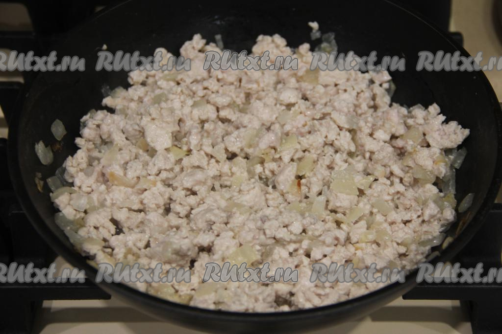 Обжарить фарш с луком, тщательно разбивая комочки фарша, в течение минут 10.