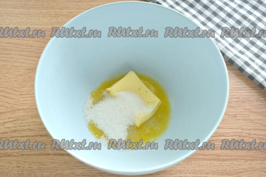 Сливочное масло для замешивания теста для вафель должно быть комнатной температуры, поэтому из холодильника его нужно достать заранее, постепенно оно согреется и станет мягким. Перекладываем мягкое масло в глубокую миску, всыпаем обычный сахар и ванильный, добавляем соль. Миксером (или венчиком) перемешиваем масло с сахаром и солью до однородности.