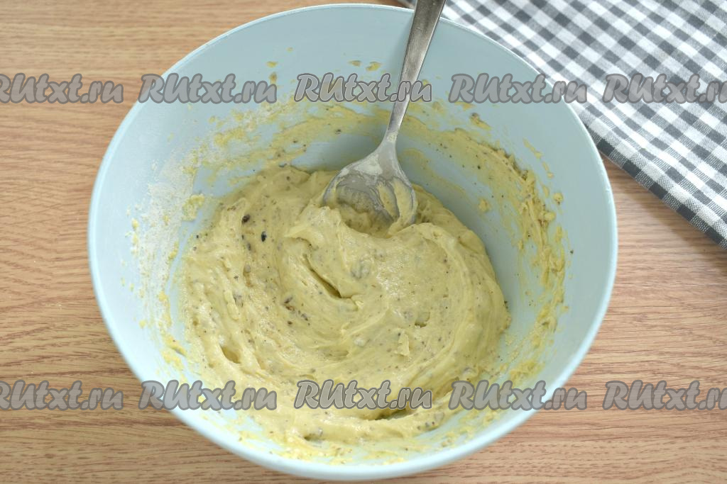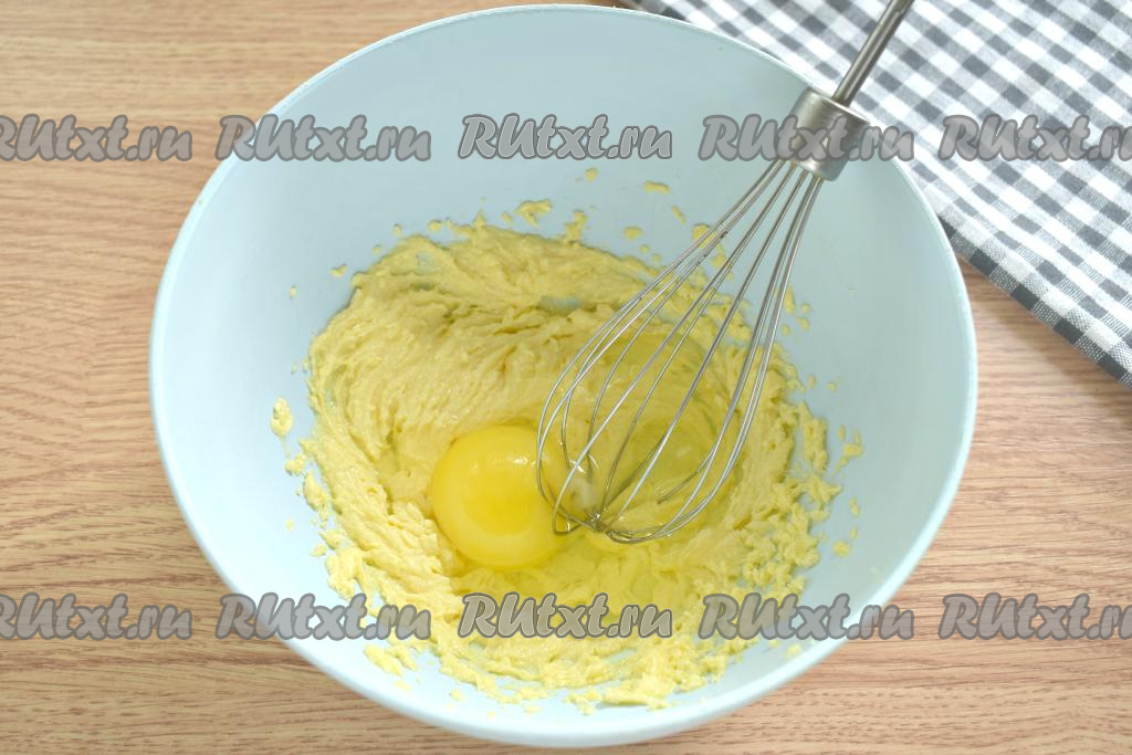 В получившуюся масляную массу по одному добавляем яйца. После добавления каждого яйца взбиваем масляно-яичную массу миксером (или венчиком) до однородности.