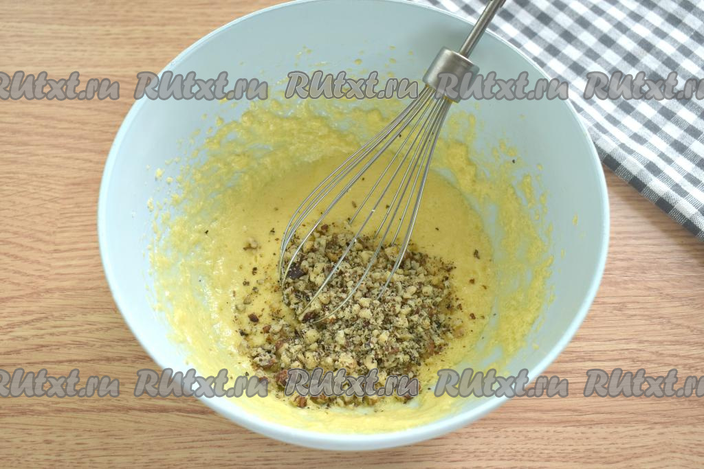 Ядра орехов (у меня - грецкие орехи) измельчаем удобным способом (я использовала погружной блендер). Если ореховая крошка будет неоднородная - ничего страшного. Измельчённые орехи добавляем в получившуюся масляно-яичную массу, перемешиваем.