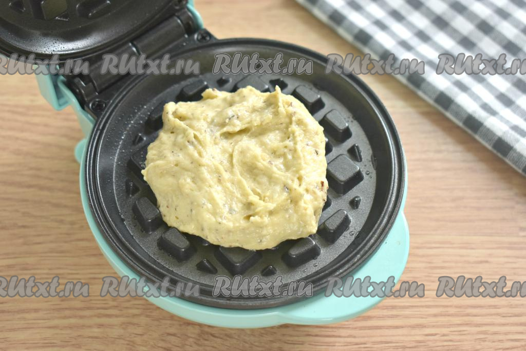 Панели электрической вафельницы смазываем растительным маслом, разогреваем. В центр выкладываем 2 столовых ложки орехового теста.
