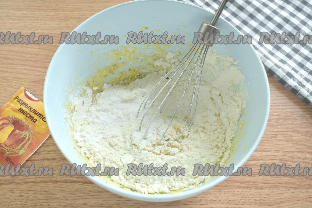 Затем всыпаем разрыхлитель, частями просеиваем муку, каждый раз тщательно вмешивая её столовой ложкой.