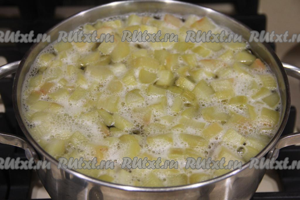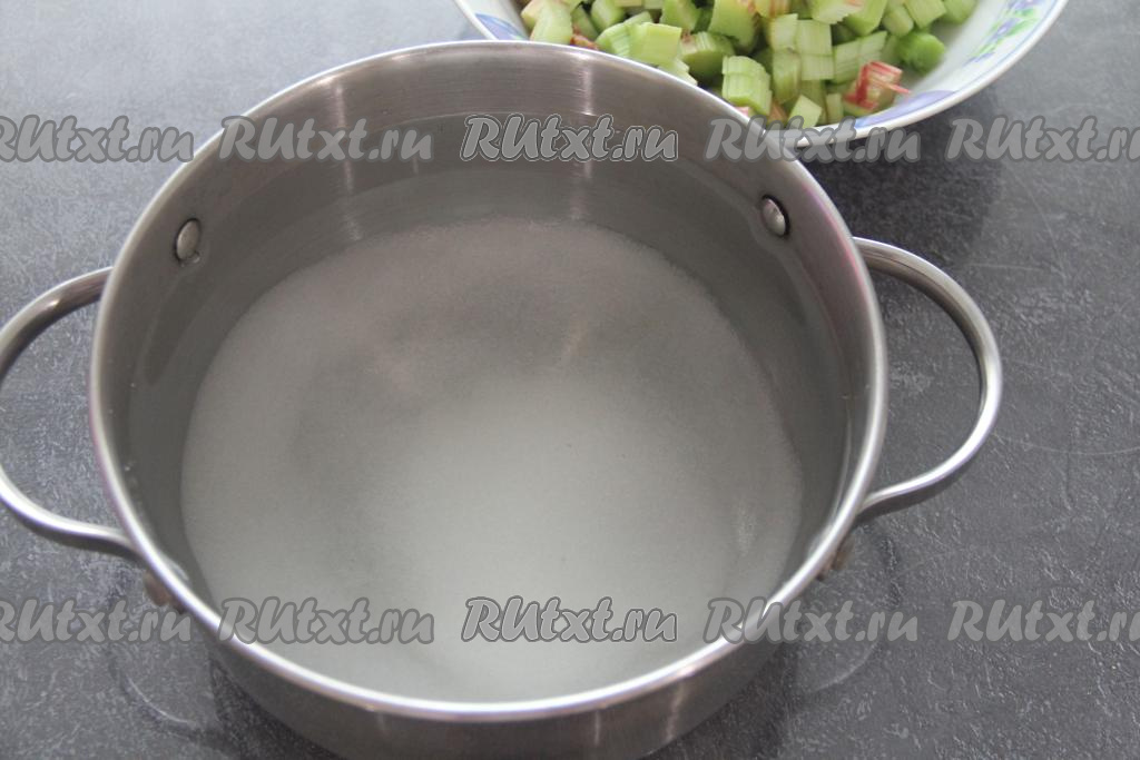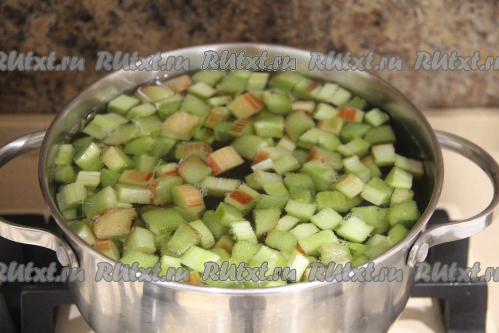 В закипевшую воду с сахаром всыпать кубики ревеня.