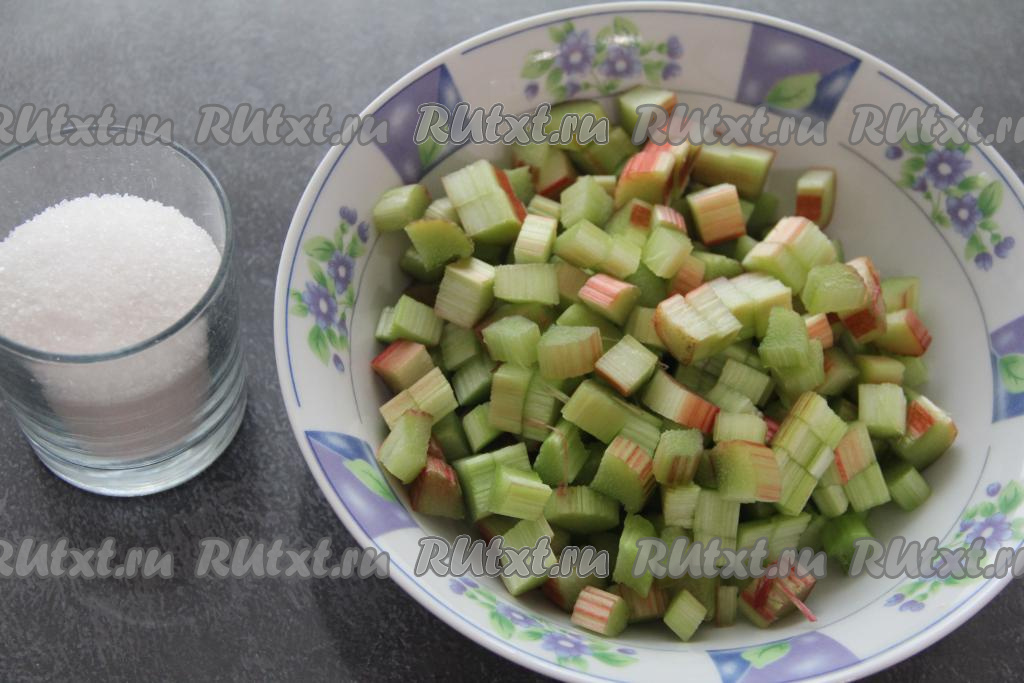 Снять тонкую плёночку, покрывающую стебли ревеня. Промыть стебли ревеня, нарезать на кубики.