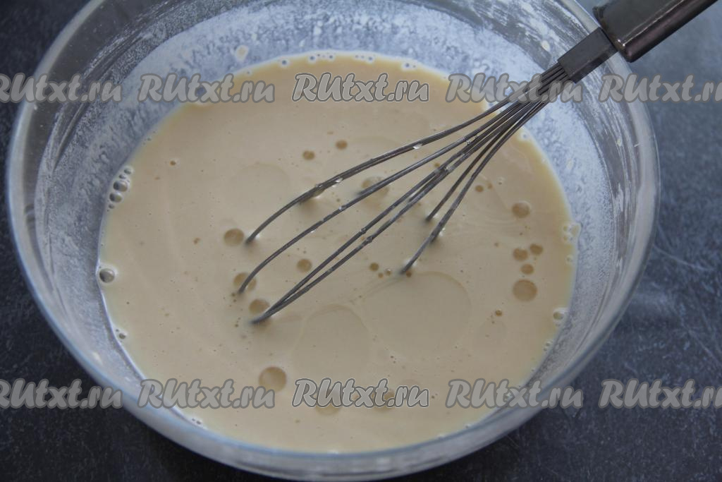Затем влить растительное масло и перемешать. Тесто для выпечки блинов должно получиться не густым, как жидкий кефир.