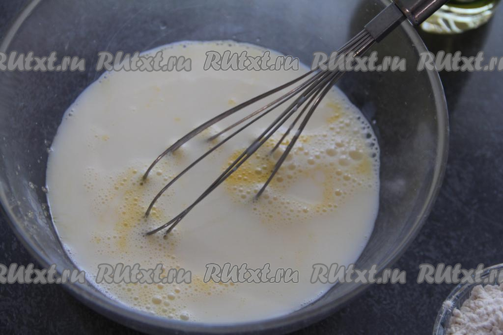 В яично-молочную смесь всыпать муку, перемешать блинное тесто до однородности и оставить постоять на 10 минут.