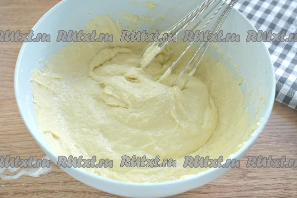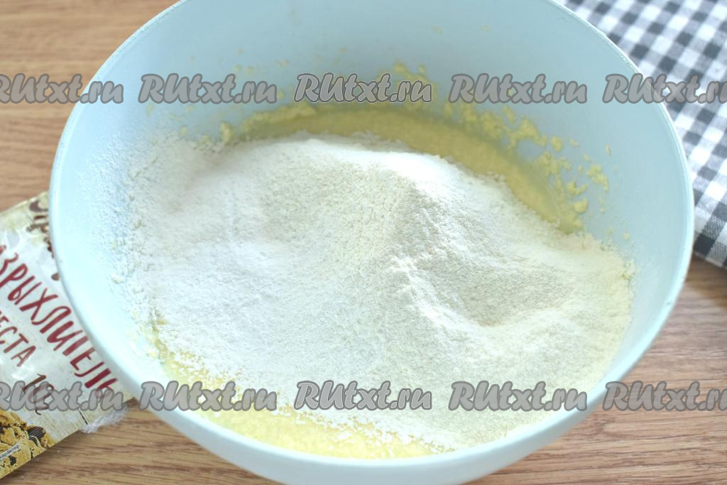 В получившуюся массу просеиваем муку вместе с разрыхлителем, перемешиваем венчиком.