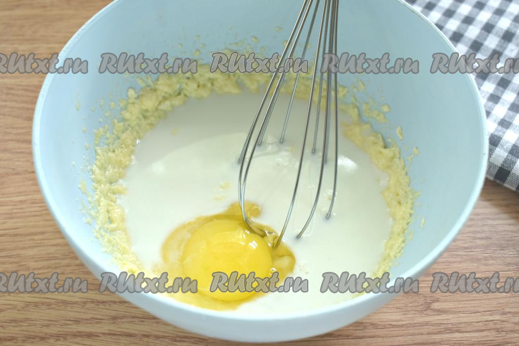 В получившуюся смесь разбиваем яйцо, вливаем тёплое молоко, снова перемешиваем (лучше перемешивать ручным венчиком, чтобы молоко не разбрызгалось).
