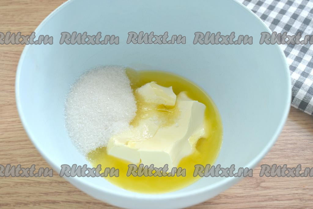 Маргарин можно достать заранее, чтобы он стал мягким при комнатной температуре, а можно прогреть в течение 10-15 секунд на максимальной мощности в микроволновке. Размягчившийся маргарин перекладываем в достаточно объёмную миску, затем всыпаем соль и сахар, перемешиваем венчиком до однородности.