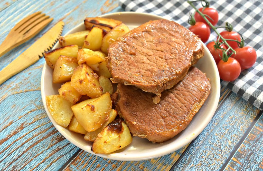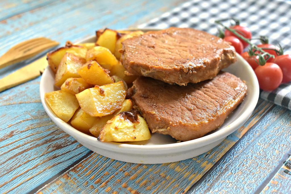 Отбивные из свинины, запечённые с кусочками картошки в духовке, можно подать к столу не только в будни, но и в праздники. Благодаря пикантному соусу, в котором маринуется мясо и покрывается картофель, блюдо получается очень вкусным. Свинина в процессе запекания становится сочной, аппетитной, а картошка - мягкой. От такого вкусного и сытного блюда отказаться практически невозможно!