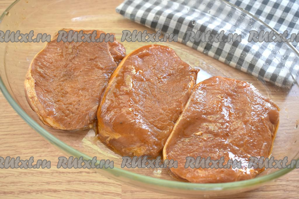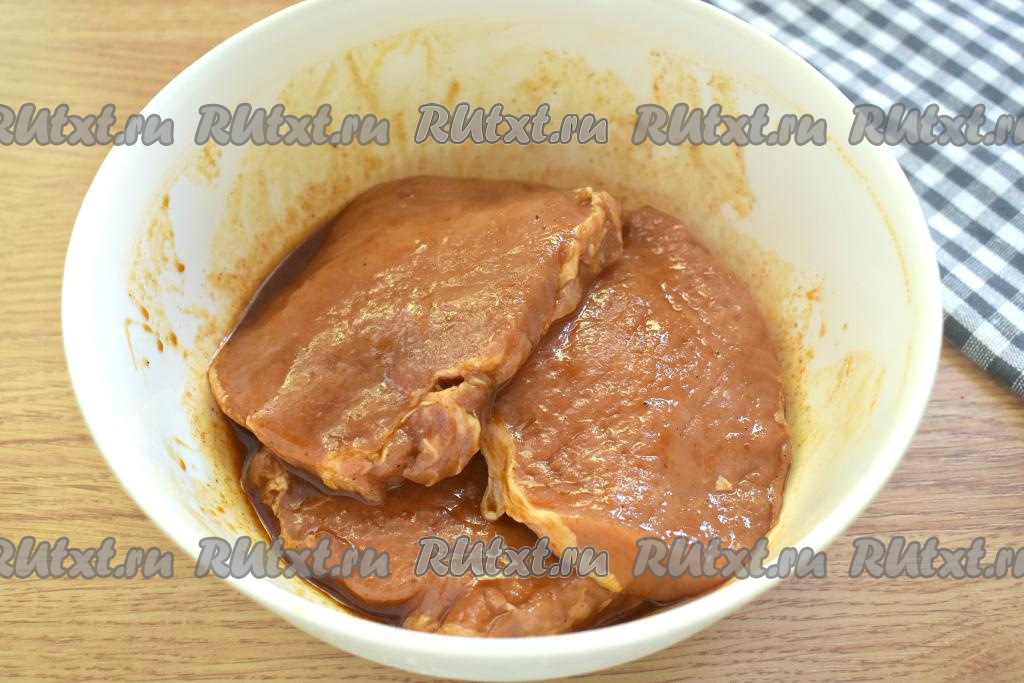 Кусочки свинины заливаем получившимся соусом, тщательно перемешиваем, покрывая отбивные со всех сторон соусом, и оставляем мариноваться на час. За это время кусочки свинины 2-3 раза переворачиваем, чтобы они равномерно замариновались в соусе.