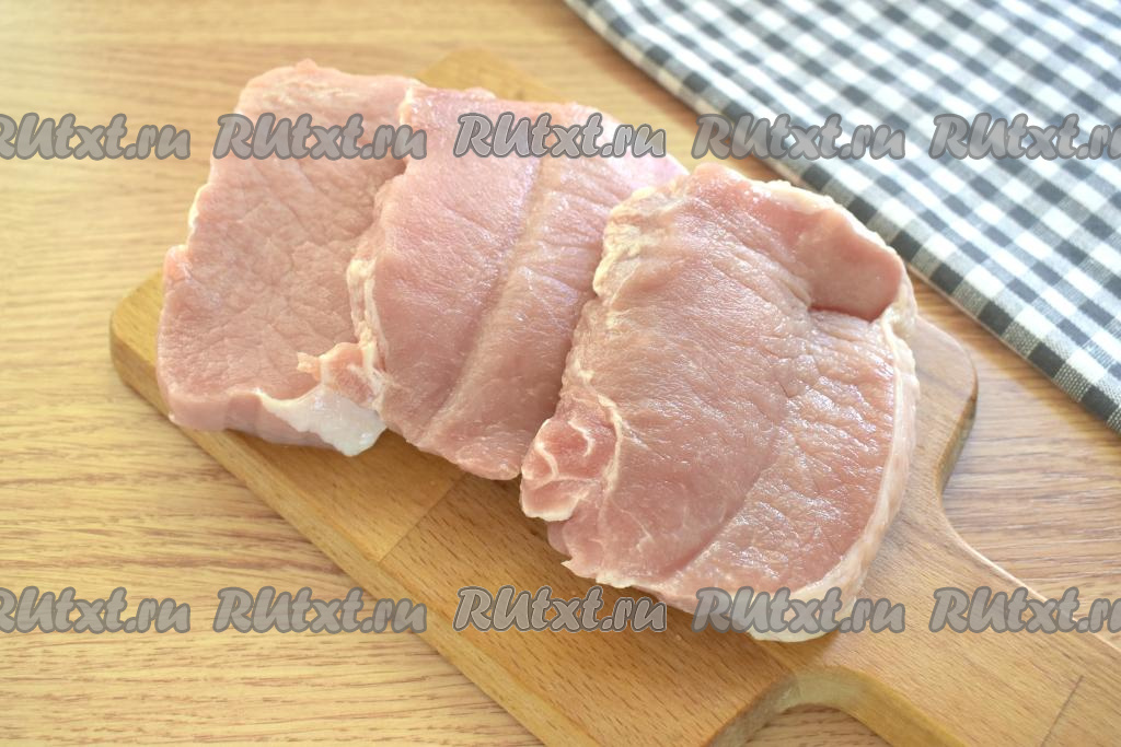 Свинину моем, нарезаем на кусочки толщиной примерно 2 сантиметра (у меня получилось 3 кусочка мяса).