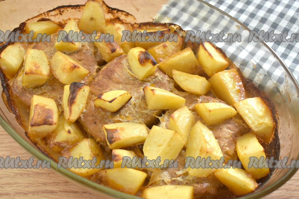 Запекаем отбивные из свинины с картошкой в духовке минут 45-50 при температуре 180 градусов. Время указано ориентировочно, ведь духовки у всех разные. Картошка и мясо должно стать мягкими (легко прокалываться ножом).