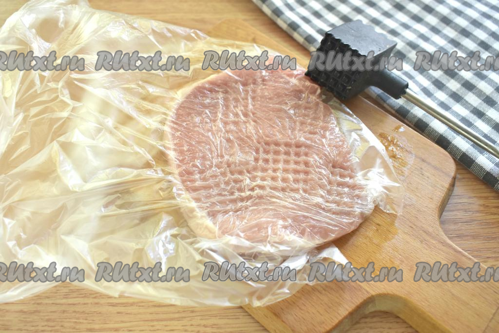 Каждый кусочек свинины поочередно помещаем в целлофановый пакет и слегка отбиваем молоточком для мяса с двух сторон.
