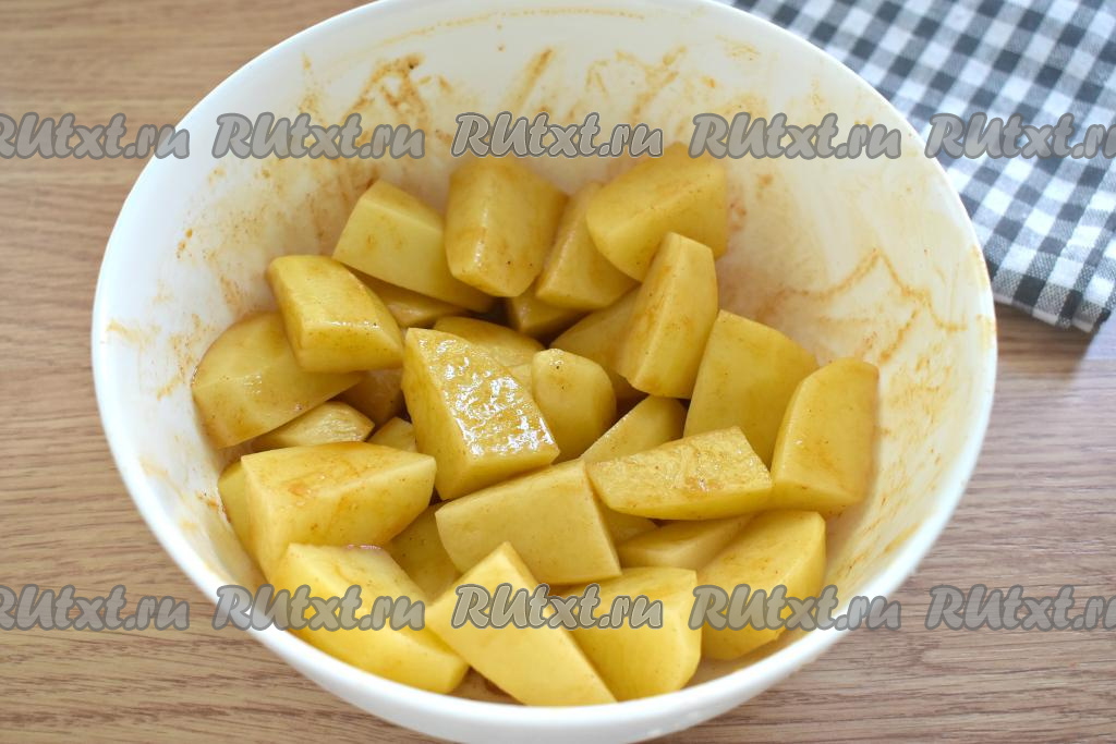 Очищаем картошку, нарезаем на крупные кубики, перекладываем в миску, в которой мариновалось мясо. Добавляем щепотку соли и перемешиваем с оставшимся соусом, покрывая картофель соусом со всех сторон.