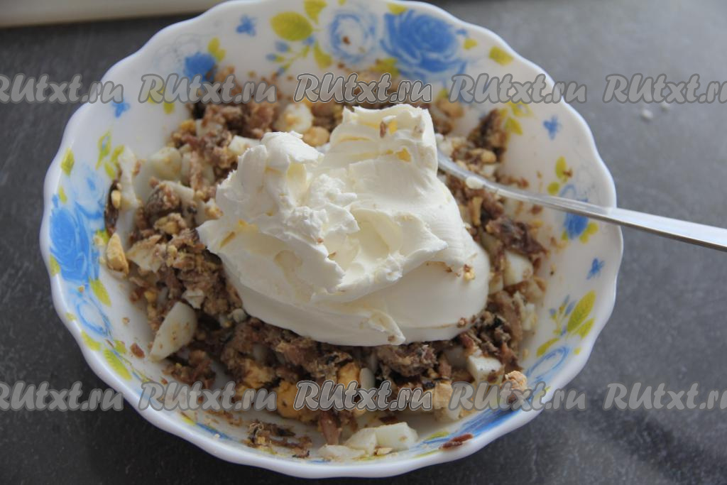 Яйца предварительно отварить в течение 10 минут с момента закипания воды, затем остудить их, почистить и мелко нарезать. Добавить яйца к рыбе.