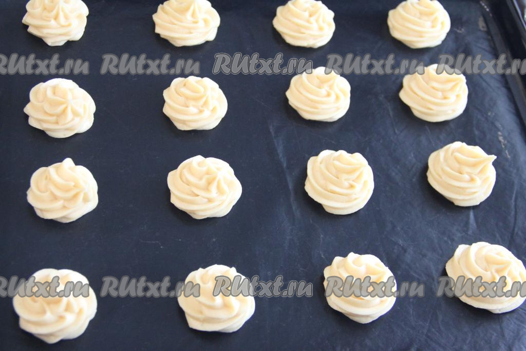 Переложить заварное тесто в кулинарный мешок и отсадить в виде профитролей на расстоянии друг от друга на противень, заранее застеленный ковриком (или пергаментом) для выпечки. У меня получилось 16 заготовок профитролей. Если нет кулинарного мешка, можно отсадить профитроли с помощью столовой ложки.