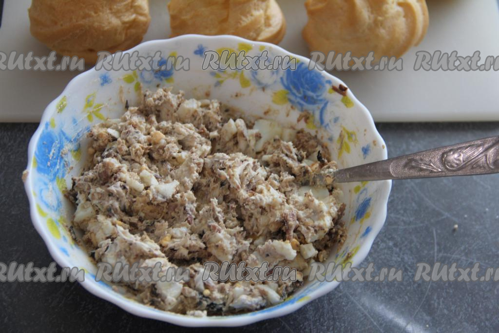 Перемешать рыбно-творожную начинку.