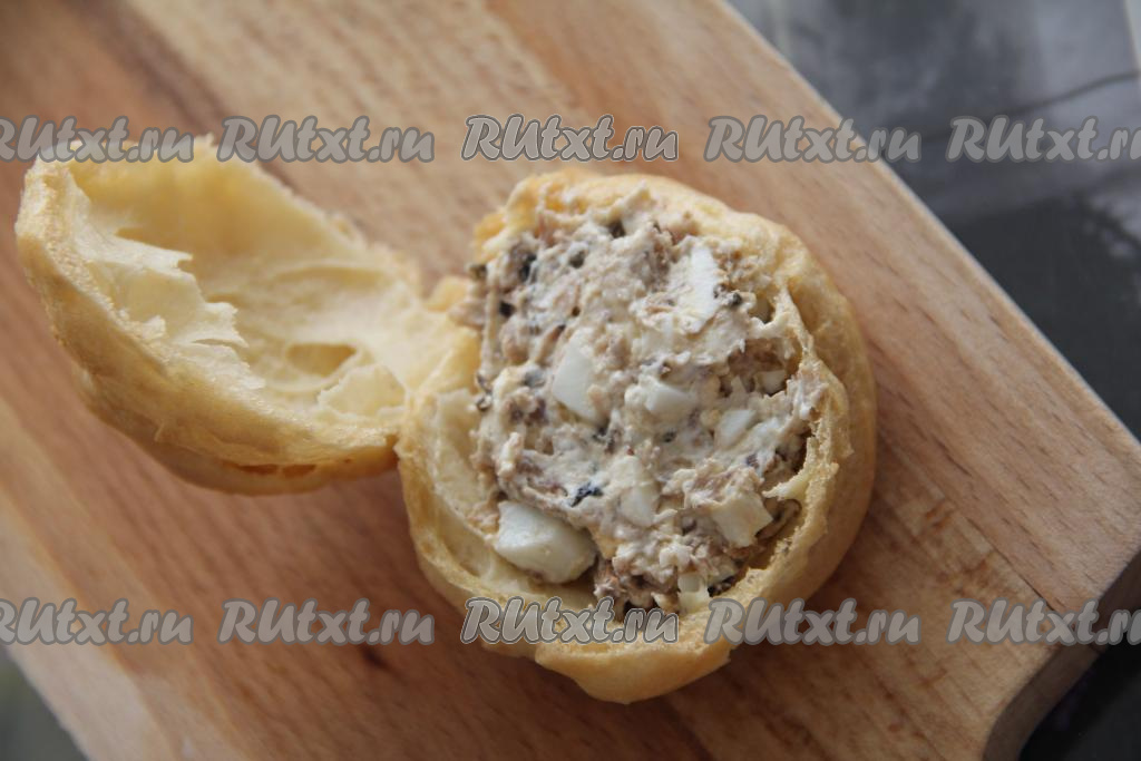 На фуршетный стол можно приготовить закусочные профитроли с несладкой начинкой из рыбы, яиц и творожного сыра. Закуска получается аппетитной, вкусной и сытной, при подаче её можно украсить тонким кружочком свежего огурца или веточкой зелени. В качестве рыбы можно использовать рыбные консервы в масле (я взяла шпроты). Такие закусочные профитроли со шпротами и творожным сыром украсят любое застолье!