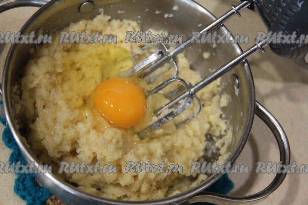 Затем начать добавлять в кастрюлю с заварной массой по одному яйцу, каждый раз тщательно вмешивая его в тесто. Я перемешивала тесто с помощью миксера, включив его на низкую скорость.