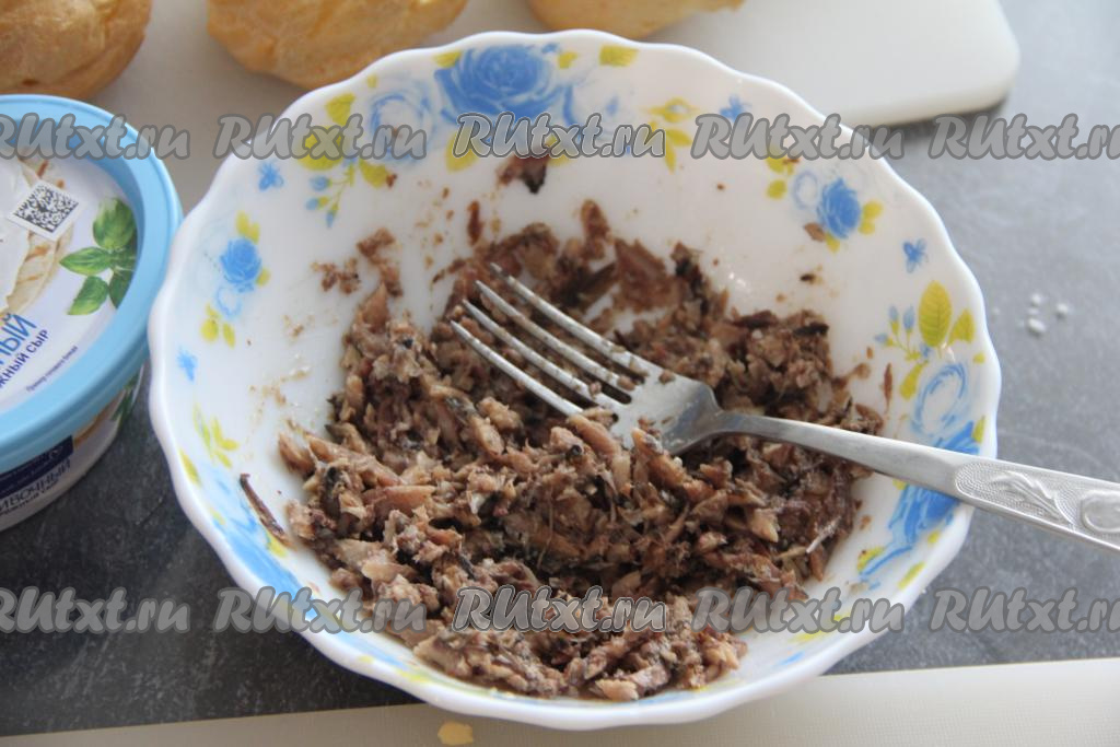 Размять шпроты вилкой.
