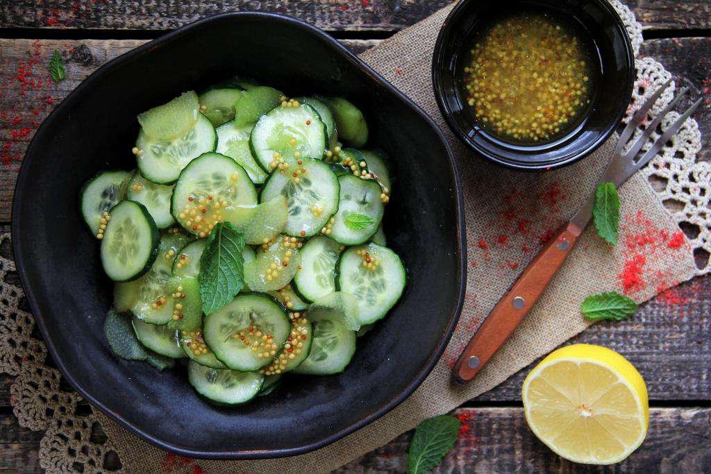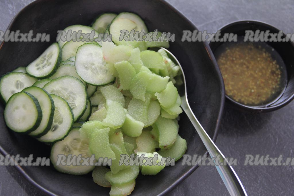 Вкусный, освежающий, сочный салат из ревеня с огурцом сразу подать к столу в качестве дополнения к мясу или различным гарнирам.