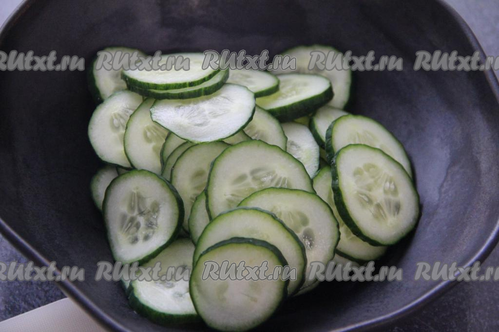 Огурчики нарезать на тонкие кружочки, выложить в салатник.