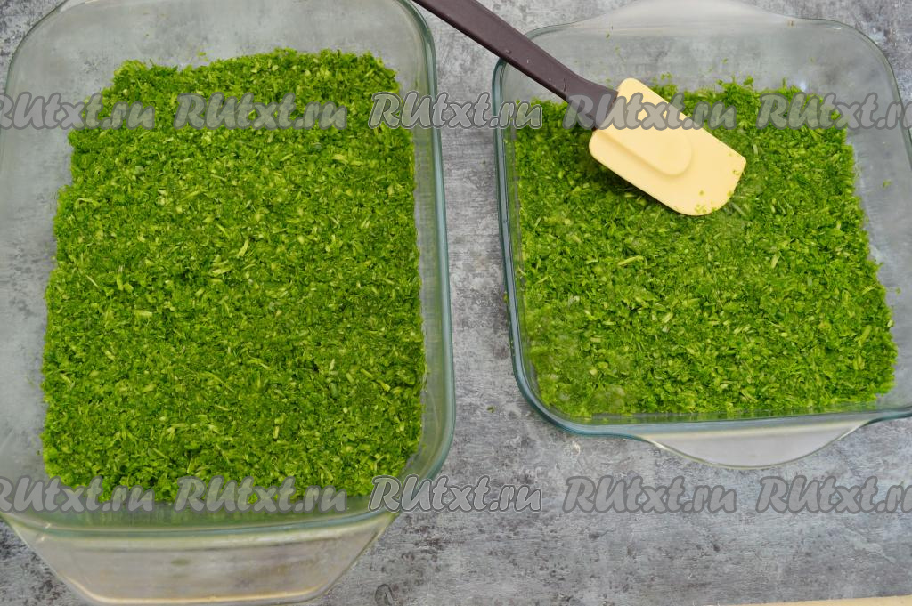 В плоские формы (я взяла стеклянные формы) ровным слоем выложить перекрученные стрелки чеснока и прижать лопаткой. Слишком толстый слой не делайте, толщина слоя из перекрученных стрелок должна быть не более 1,5 сантиметров.