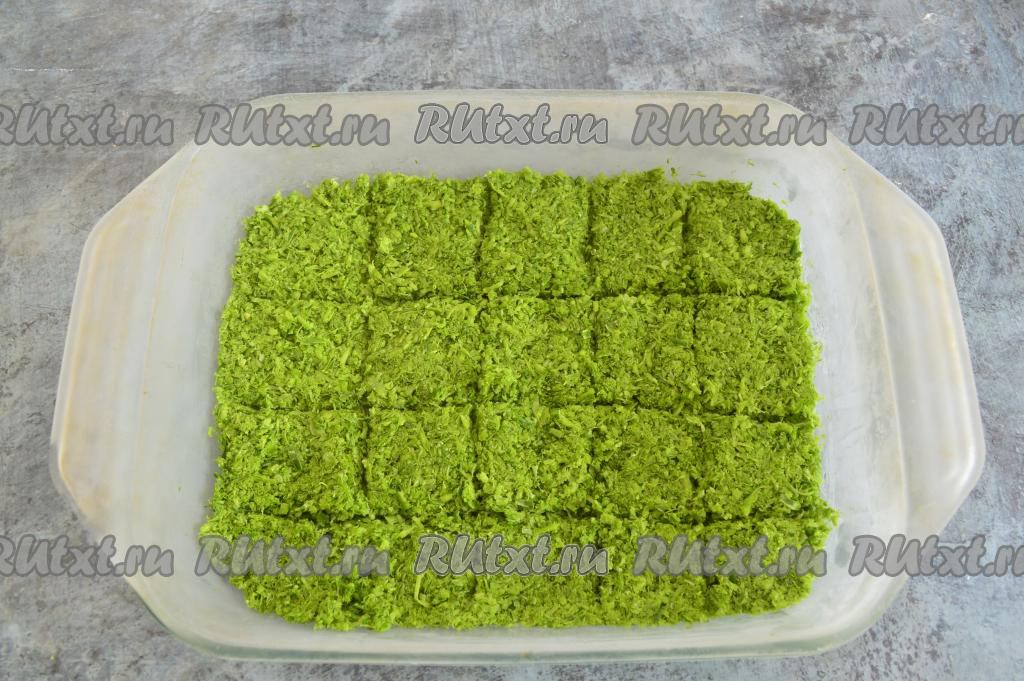 Лопаткой сделать бороздки в слое чеснока, доходя до дна формы, разделив слой на примерно равные квадраты, как на фото. Это делается для того, чтобы можно было потом замороженный слой легко разделить на равные кусочки.