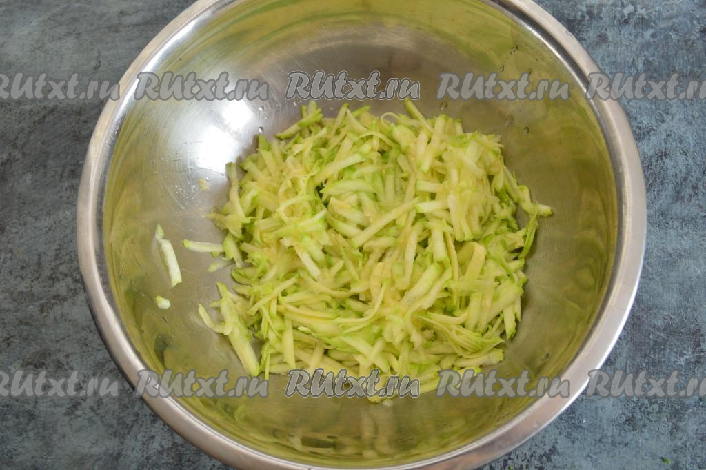 Натереть кабачок на крупной тёрке, присолить и оставить на 10 минут. По прошествии времени кабачок выделит сок, который необходимо отжать (для того чтобы отжать лишний сок из кабачков, я беру частями кабачковую массу в руку и сжимаю, выделившийся сок нам не понадобится).