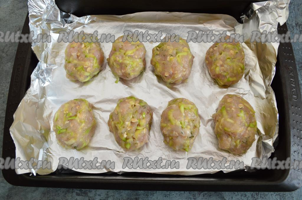 Форму для запекания застелить фольгой. Влажными руками сформировать из курино-кабачкового фарша котлеты (я сформировала 8 штук) и выложить их в подготовленную форму.