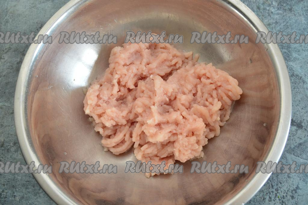 Куриное филе вместе с репчатым луком пропустить через мясорубку, перемешать фарш.