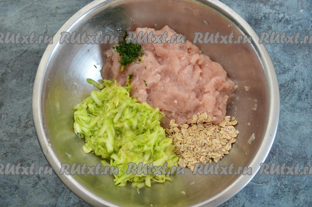 В миску к куриному фаршу выложить отжатый от сока кабачок, нарезанную мелко зелень, овсяные хлопья и соль по вкусу.