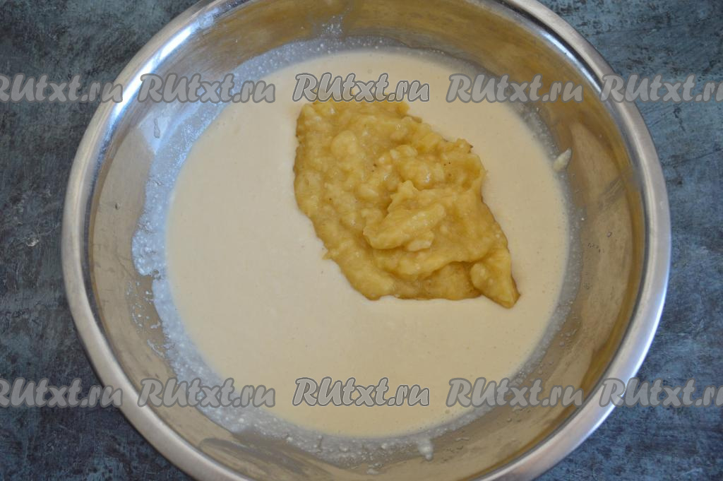 Добавить банановую массу в миску с творожным тестом и перемешать венчиком до однородности. Творожное тесто, замешанное с добавлением банана и манки, получится в меру густым, напоминающим сметану средней жирности.