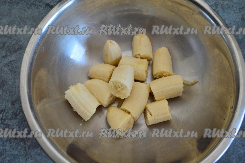 По прошествии времени бананы очистить, разломать на крупные кусочки и выложить в отдельную миску. Заранее чистить бананы не надо, иначе они могут потемнеть. У меня вес бананов вместе с кожурой был 420 грамм.