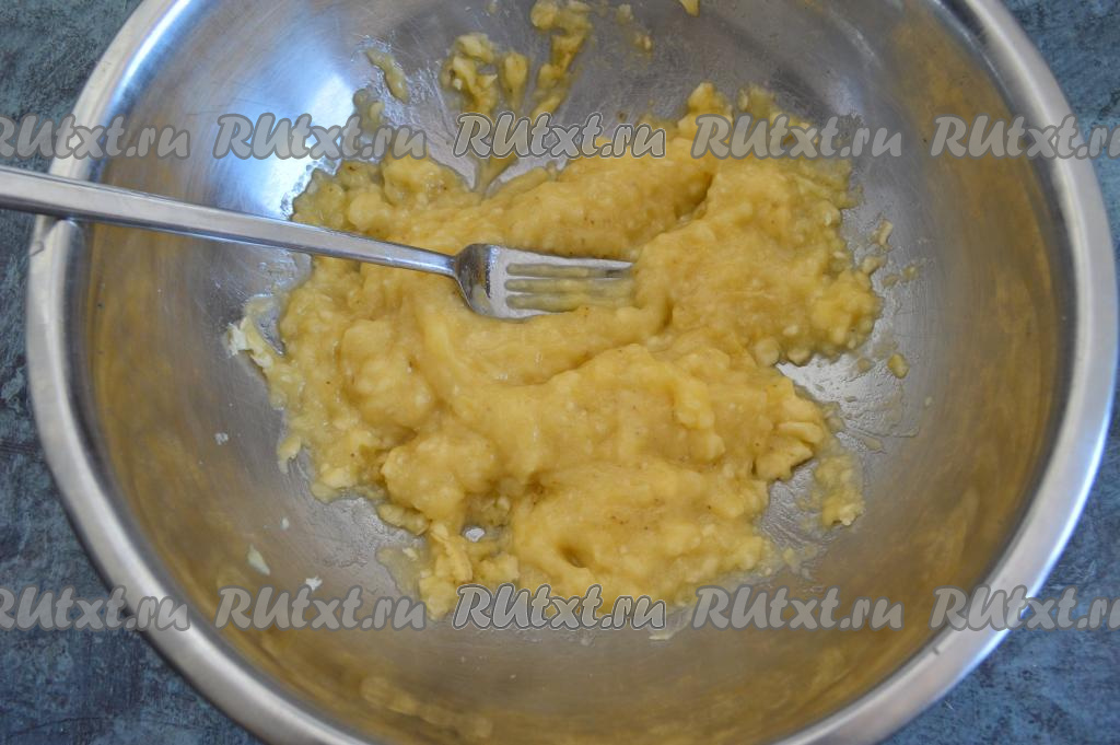 Размять вилкой бананы в однородную массу. Спелые банана разминаются легко и быстро.