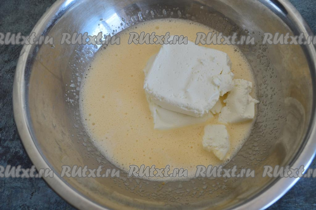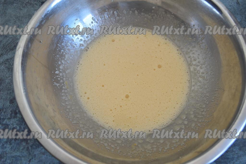 В глубокой миске взбить венчиком яйца с сахаром до однородной, пышной массы (взбивать нужно интенсивно в течение 1-2 минут). Масса должна посветлеть.