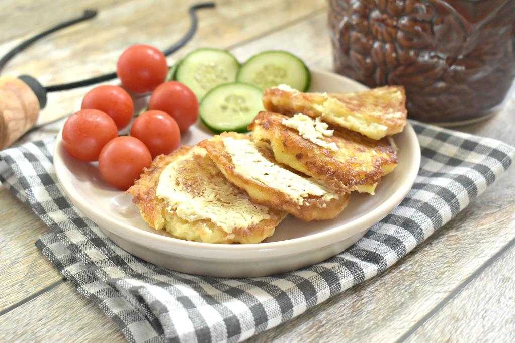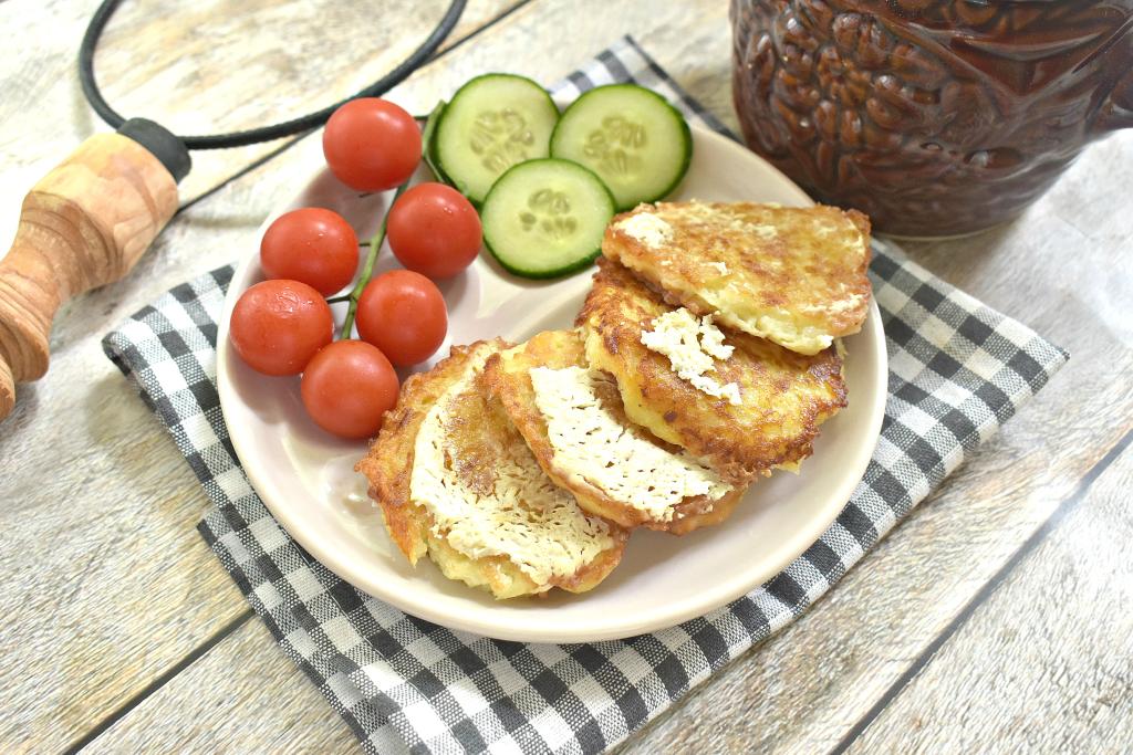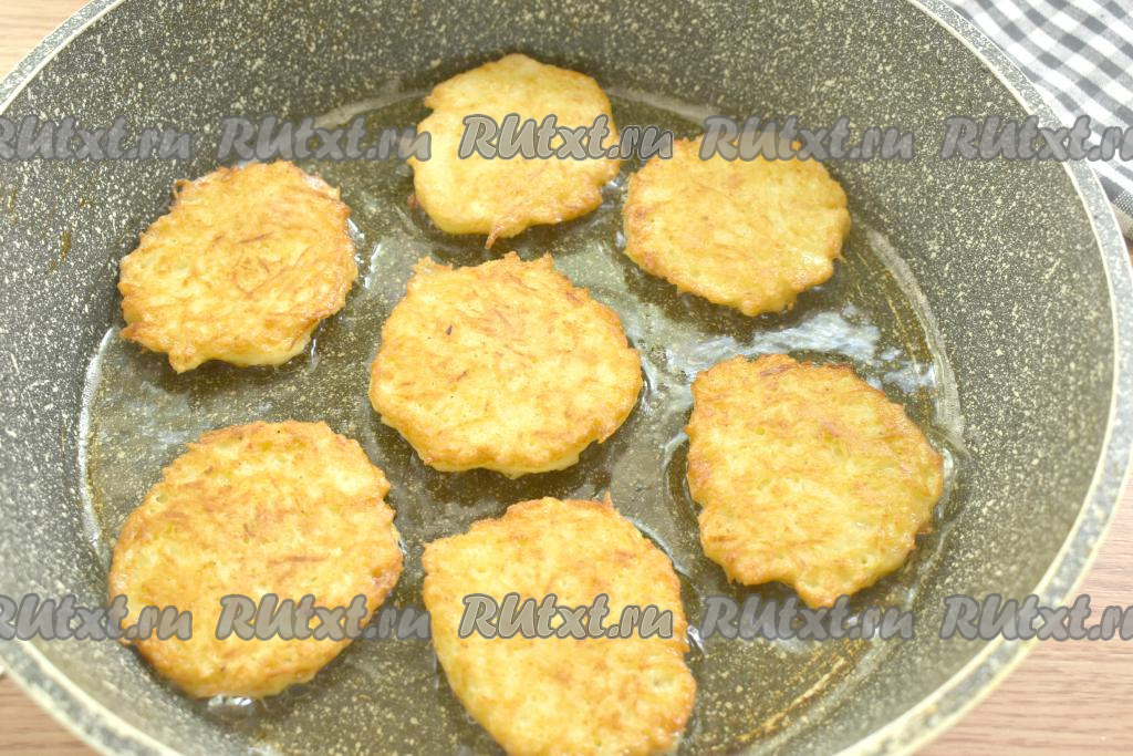 Разогреваем на сковороде растительное масло, затем выкладываем по столовой ложке картофельного теста в виде круглых оладий. Жарим драники на среднем огне до румяности с двух сторон (примерно по 2-3 минуты с каждой стороны).