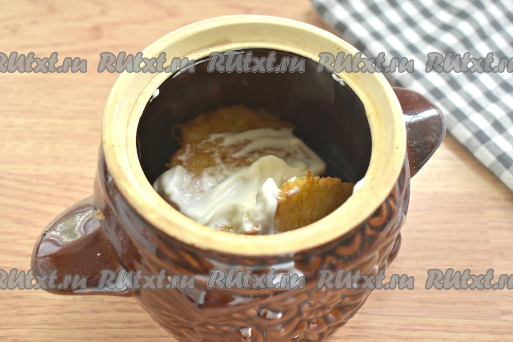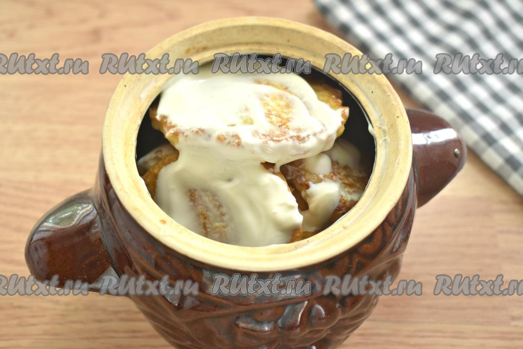 Выкладываем ещё 2-3 драника, их тоже смазываем сметаной. Таким образом, чередуя драники и сметану, заполняем весь горшочек. В горшочек объёмом 550 миллилитров у меня поместились все 10 драников. Если у вас горшочки поменьше, тогда возьмите 2 горшочка.