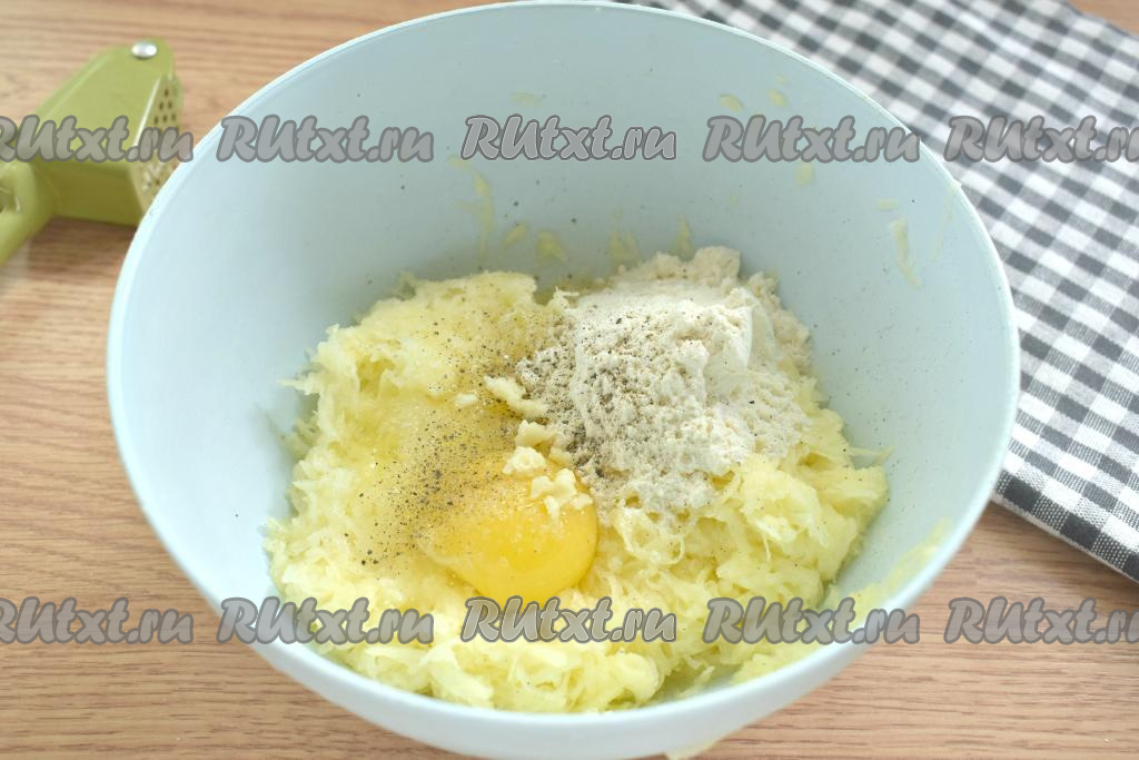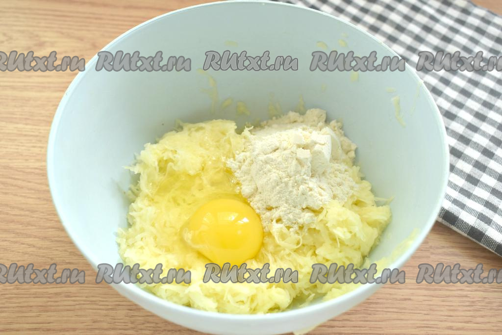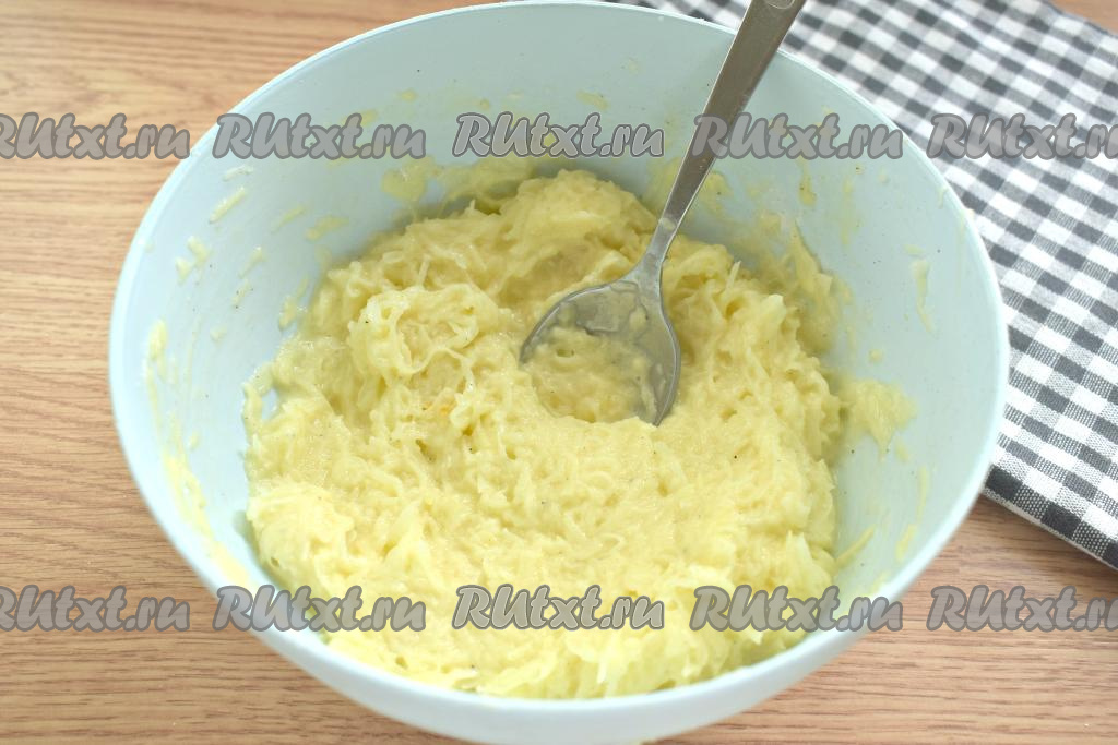 400 грамм очищенного картофеля натираем на средней тёрке. Слегка отжимаем получившуюся картофельную массу (выделившийся при этом сок нам не понадобится) и перекладываем в глубокую миску.