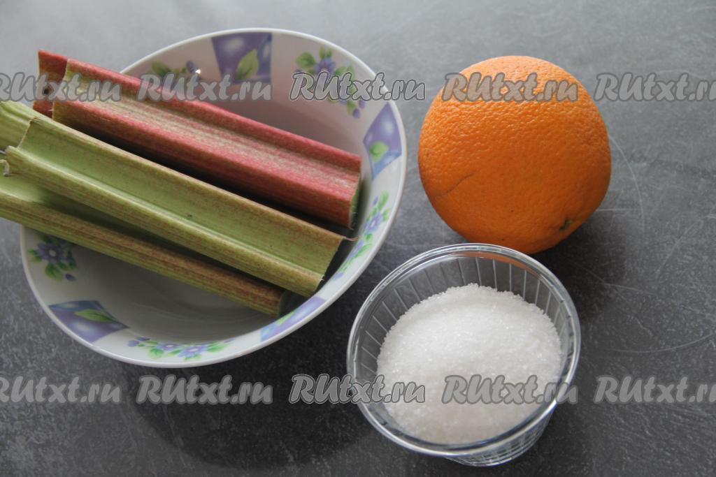 Подготовить продукты. Снять тонкую плёночку, покрывающую стебли ревеня. Апельсин хорошо вымыть.