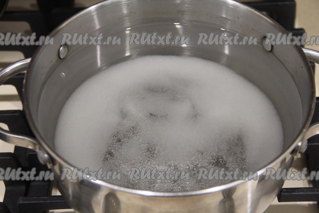 Воду влить в кастрюлю, всыпать сахар, поставить на сильный огонь, довести до кипения.