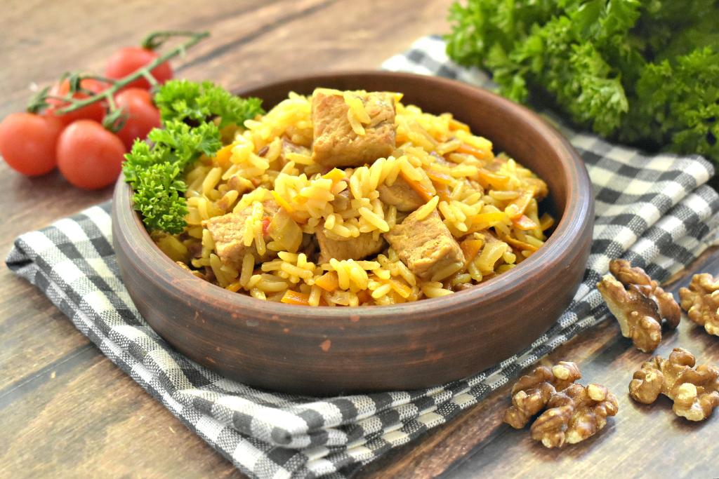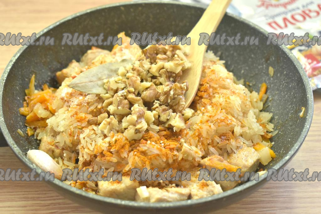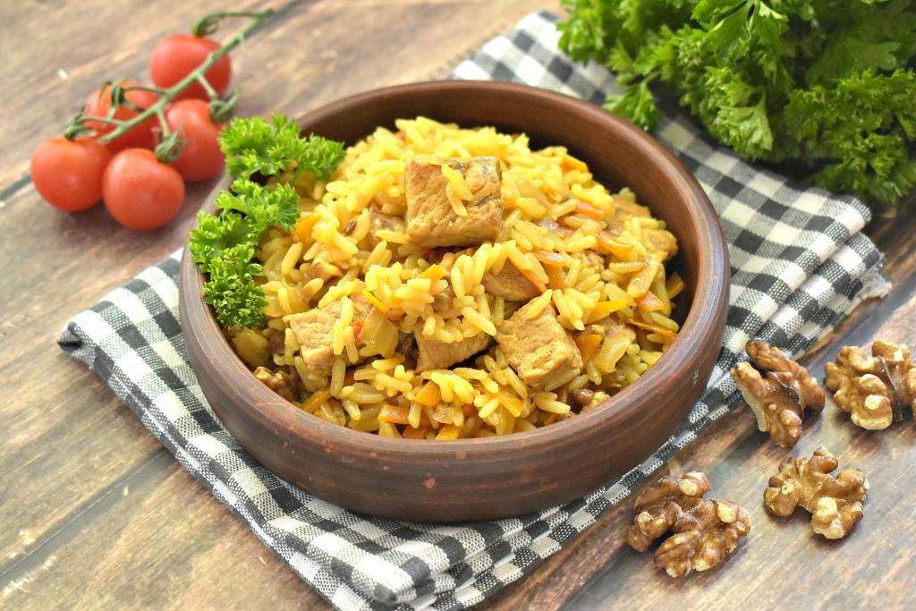 Ароматный, сытный и вкусный плов с грецкими орехами и свининой подаём к столу.