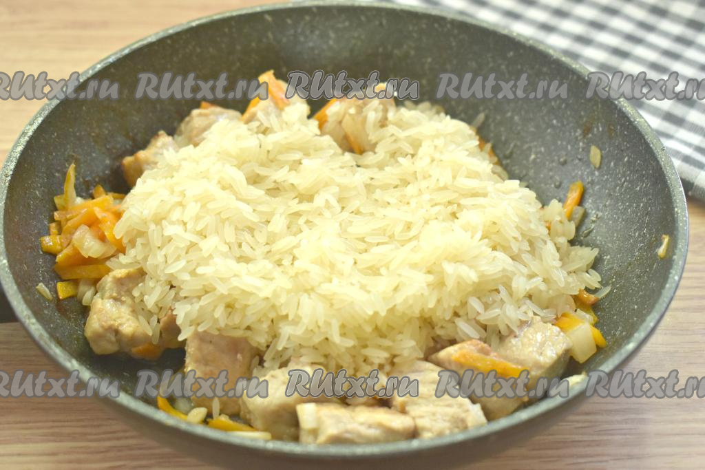Рис промываем несколько раз водой, даём воде стечь. Рис выкладываем на сковороду к мясу и овощам.