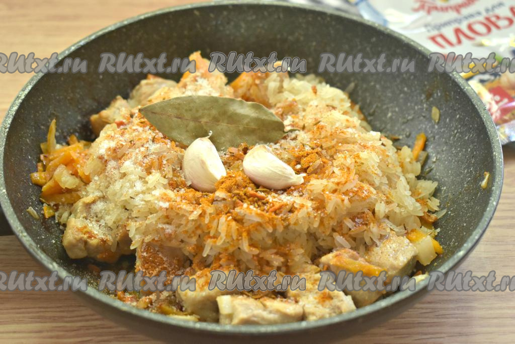По вкусу солим, всыпаем приправу для плова. Добавляем неочищенные зубчики чеснока, лавровый лист.
