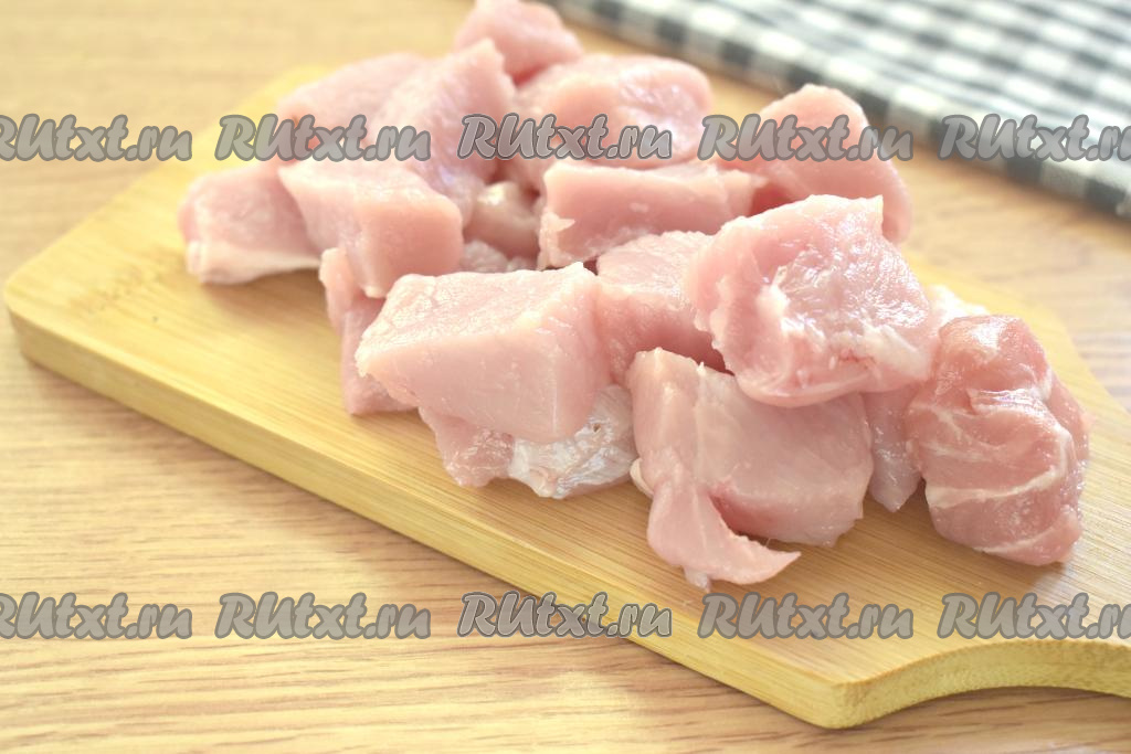 Свинину моем, слегка обсушиваем и нарезаем на средние кусочки. Я готовила плов в глубокой сковороде, но подойдёт и казан или сотейник. Вливаем в сковороду растительное масло, разогреваем его и выкладываем кусочки свинины.