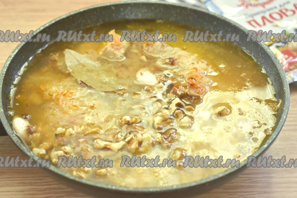 Готовим рис с орехами и мясом 25-30 минут (до испарения воды). Выключаем огонь, плову даём настояться под крышкой 5-10 минут.