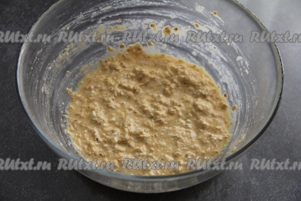Перемешать массу вилкой (или венчиком). Масса получится, как достаточно густая сметана. Дать ей постоять 5 минут, чтобы овсянка набухла.
