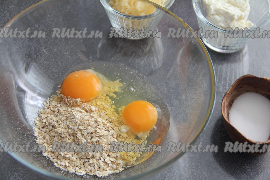 В миску всыпать овсяные хлопья и вбить сырые яйца.
